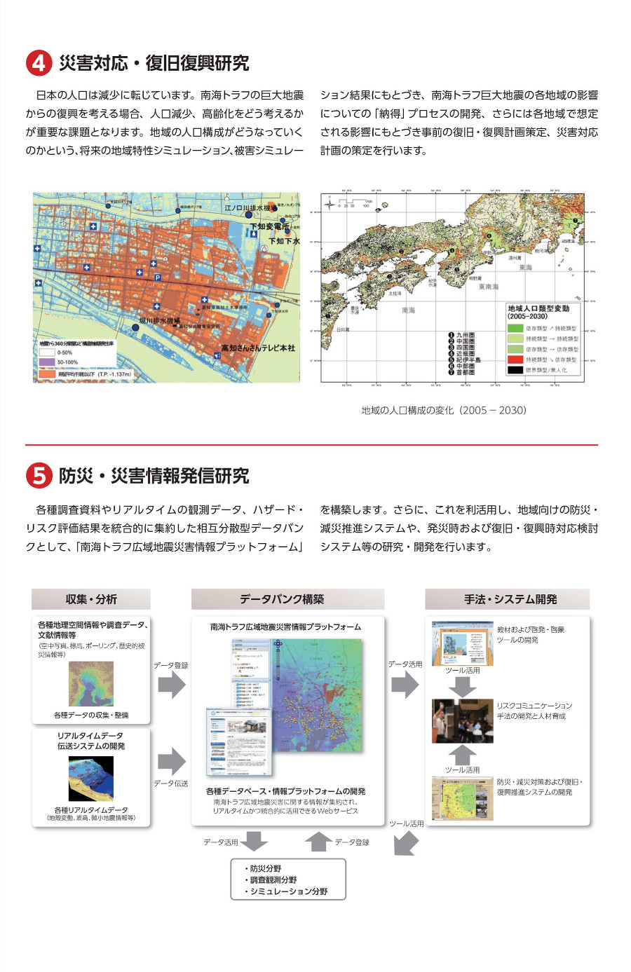 将来発生が危惧される南海トラフ巨大地震へ備える研究を理学・工学・社会科学の連携で実施し、地震・津波の被害予測とその対策、発災後の現実的な復旧・復興対策を検討しています。