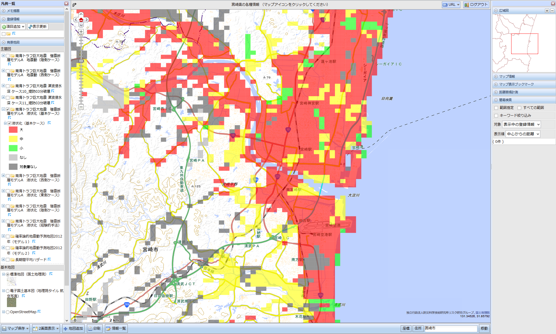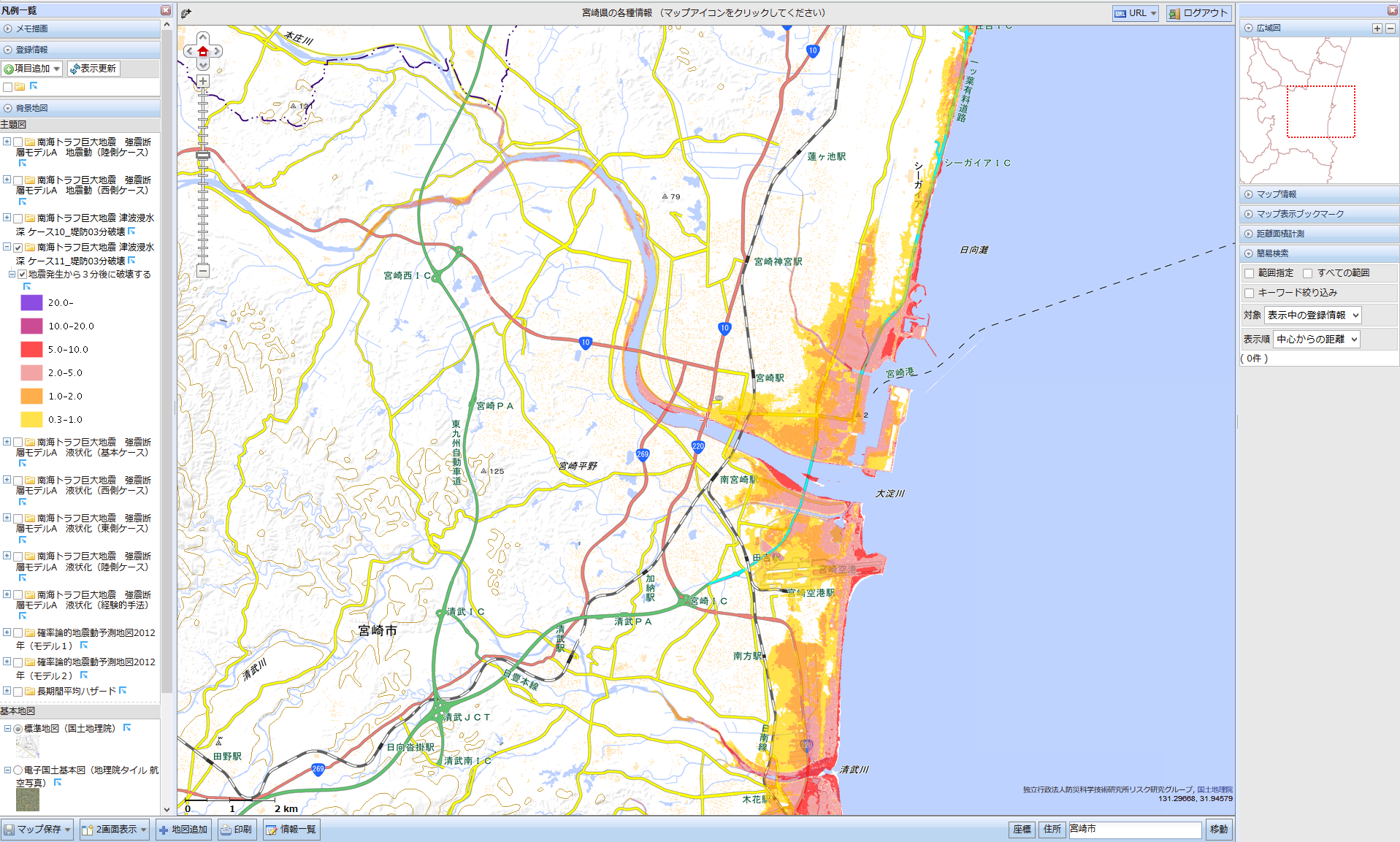 過去の自然災害事例を発生年ごとに市区町村単位でWeb地図上に表示するアプリケーションです。地方単位、県単位あるいは災害種別単位で情報を絞り込み、閲覧することも可能です。背景地図は国土地理院発行 地理院地図を使用しています。