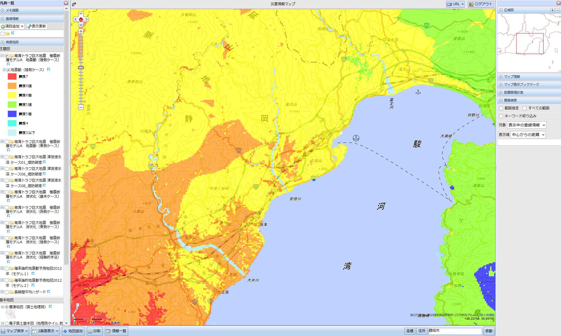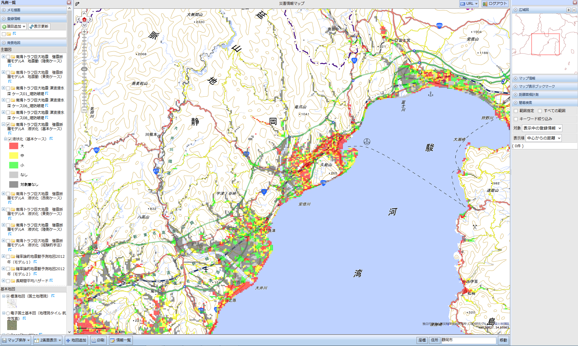 過去の自然災害事例を発生年ごとに市区町村単位でWeb地図上に表示するアプリケーションです。地方単位、県単位あるいは災害種別単位で情報を絞り込み、閲覧することも可能です。背景地図は国土地理院発行 地理院地図を使用しています。