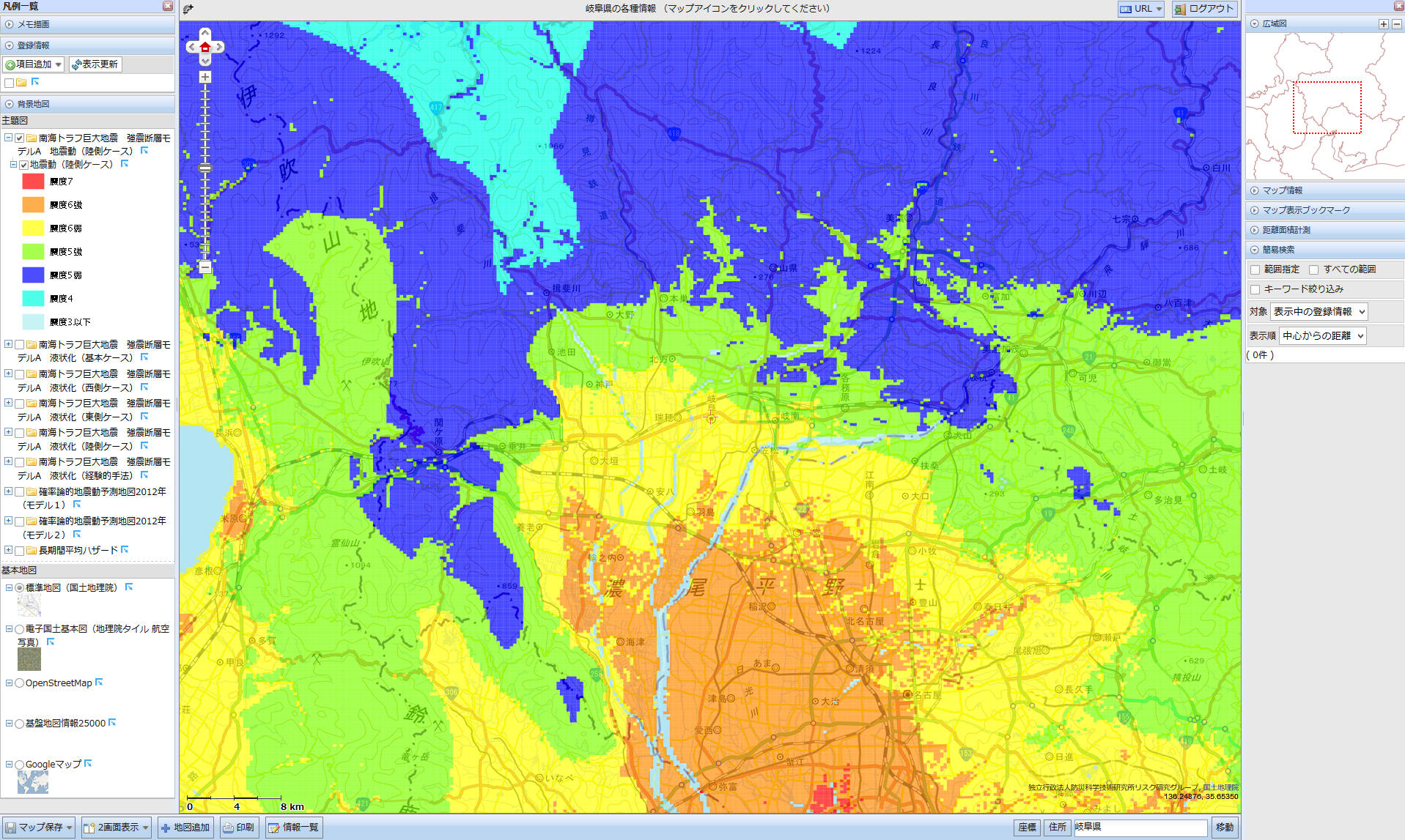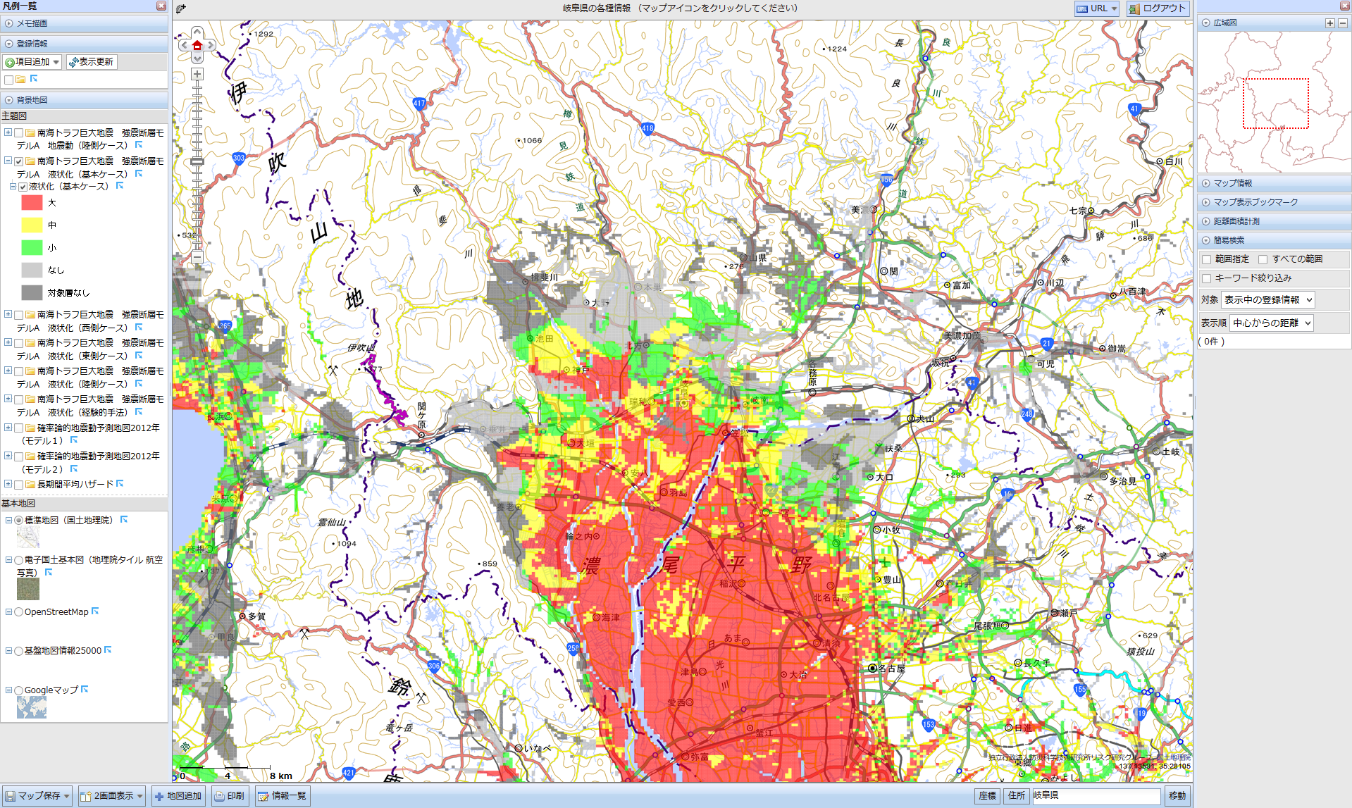 過去の自然災害事例を発生年ごとに市区町村単位でWeb地図上に表示するアプリケーションです。地方単位、県単位あるいは災害種別単位で情報を絞り込み、閲覧することも可能です。背景地図は国土地理院発行 地理院地図を使用しています。