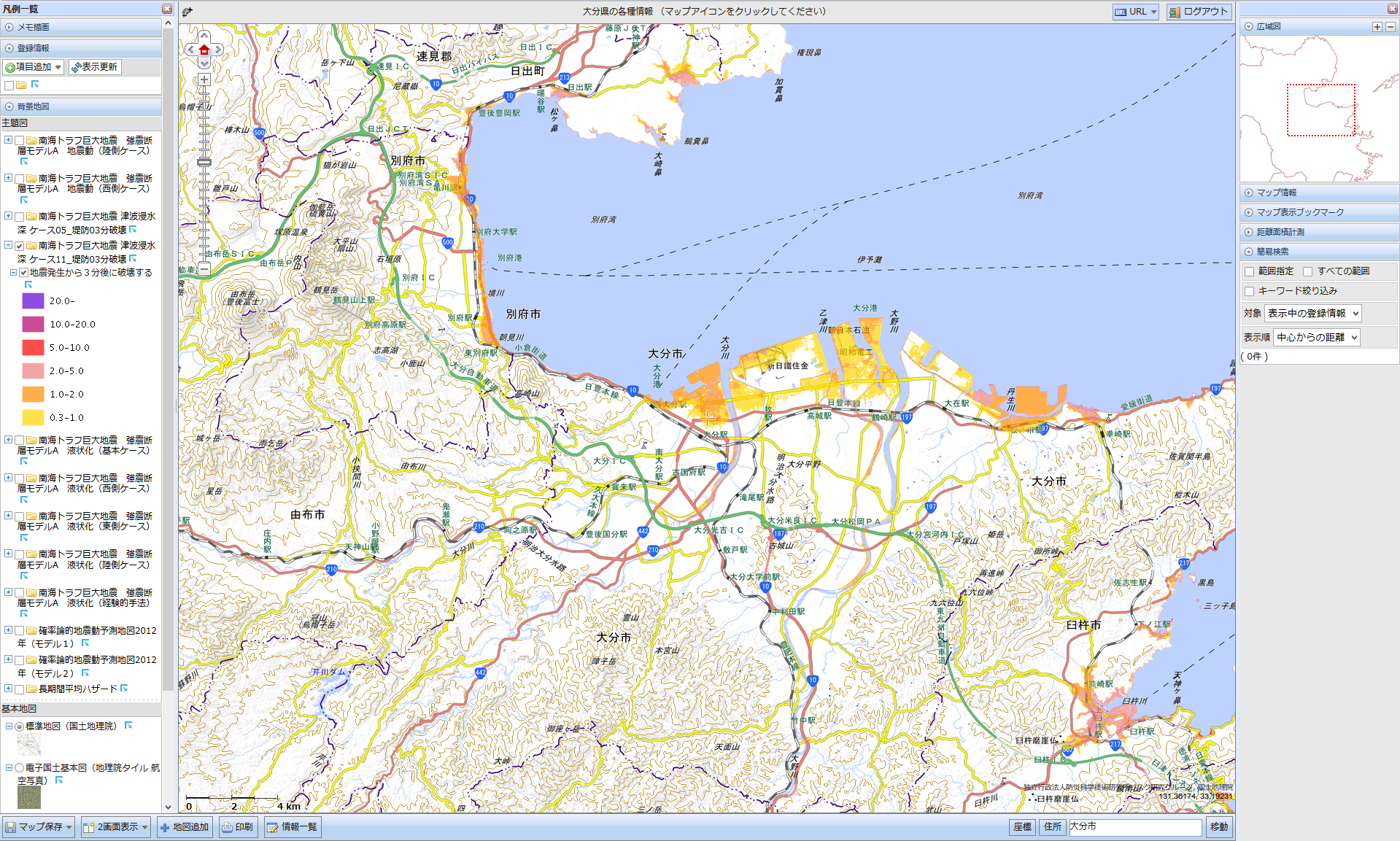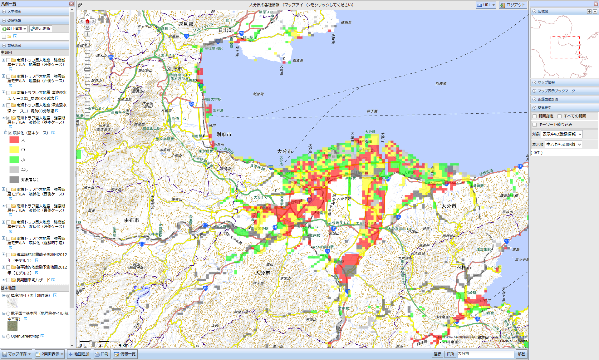 過去の自然災害事例を発生年ごとに市区町村単位でWeb地図上に表示するアプリケーションです。地方単位、県単位あるいは災害種別単位で情報を絞り込み、閲覧することも可能です。背景地図は国土地理院発行 地理院地図を使用しています。