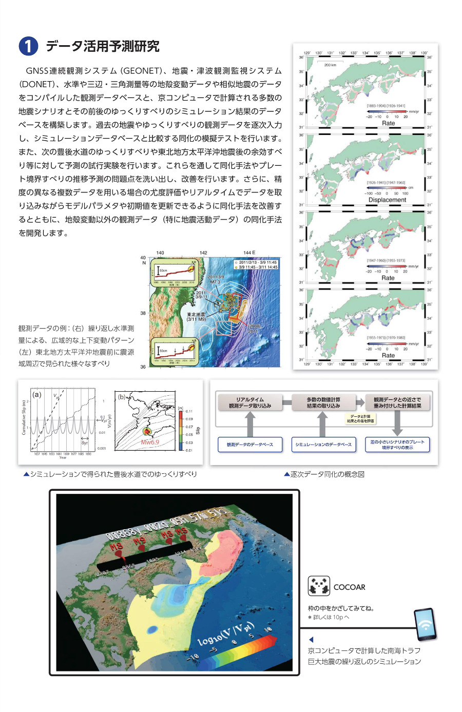 特に内閣府による最大級の地震断層モデルを念頭に、南西諸島海域までの連動発生を考慮に入れて地下構造モデルを求め、津波履歴や地震の広帯域観測からプレート境界のすべり特性の時空間分布を明らかにしています。これらを用いて3次元不均質を含んだ高精度構造モデルから地震発生予測を行い、南西諸島海域までを含んだ震源モデルを構築、地震動と津波のハザードを評価し、防災・減災対策へ活かします。