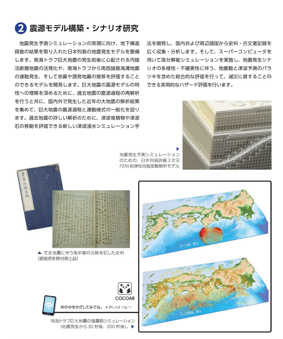将来発生が危惧される南海トラフ巨大地震へ備える研究を理学・工学・社会科学の連携で実施し、地震・津波の被害予測とその対策、発災後の現実的な復旧・復興対策を検討しています。